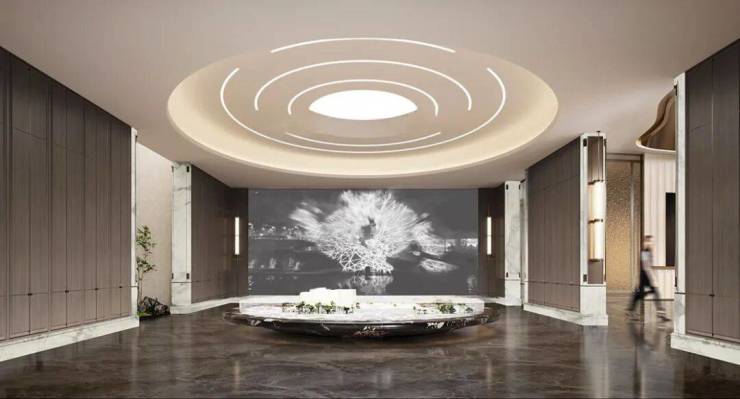 除了宏大的景观布局,中铁建西派天河序在归家仪式感上也做到了极致。8.18 米高、44.6 米长的主入口门楼,气势恢宏,彰显着主人的尊贵身份。门楼前方搭配了 50 米长的弧形水景,波光粼粼,倒映着蓝天白云,宛如一条玉带环绕门前。此外,造价高达 200 万的艺术照壁更是点睛之笔,其上雕刻着精美的图案,寓意吉祥富贵,为整个社区增添了一份厚重的文化底蕴。