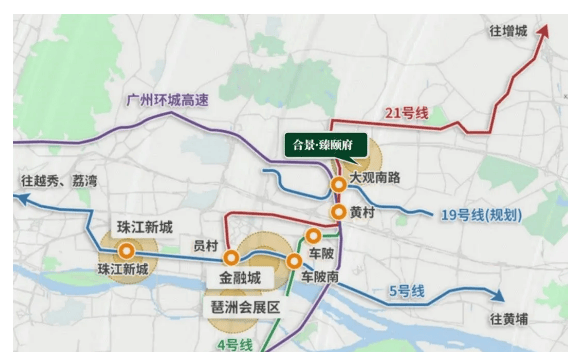 交通配套多维便捷,自驾可快速通达珠江新城、金融城(20 分钟内),通过白云机场、广州南站实现跨城互联;现有地铁 21 号线智慧城站(1.5 公里,AI 智慧车站)、4 号线黄村站(2 公里),规划中地铁 19 号线大观南站(2025 年开通,覆盖广佛);在建广佛东环线、穗莞深城际轨道,直通两大交通枢纽,满足高端人群多元出行需求。