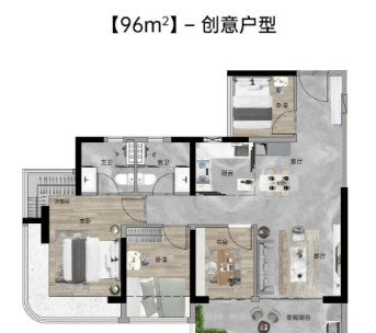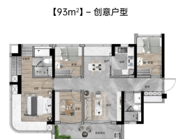 93-100㎡四房:独立玄关+南北通透+6.1米巨幕阳台,在阳台跑步不是梦~