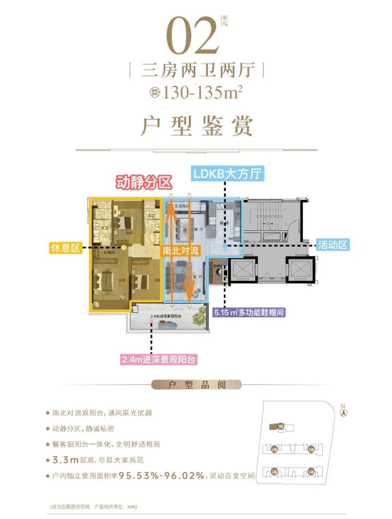 户型方面,最小面积130平方米三房,最大面积224-229平方米四房,只有两种户型,但每一种都做得非常精致。值得一提的是,小高层8楼以下是旧规,8楼以上是新规。新规产品的使用率更高,这一点在交付后会让业主感受到实实在在的实惠。
