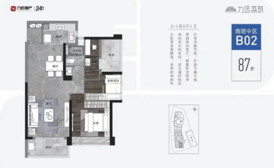 力迅荔筑项目整体规划建设2栋楼,分为北塔和南塔,两栋楼均为24层高层建筑,整体布局合理,保证了各楼栋的通风和采光效果。项目一层和二层规划为商业配套和肉菜市场,三层及以上为住宅产品,地下两层为停车场,实现了商业与居住的分区规划,既满足了居民的日常生活需求,又保障了居住环境的静谧性。