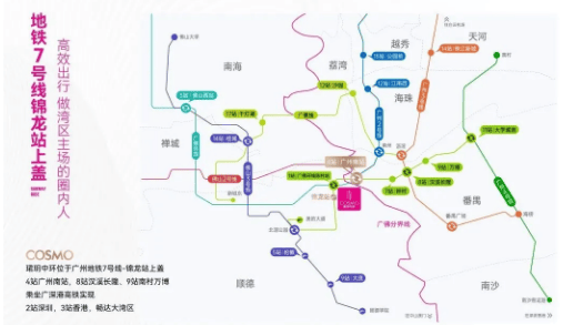 交通配套方面,珺玥中环堪称“双地铁上盖、立体路网环绕”的典范,出行便捷度拉满。项目位于广州地铁7号线锦龙站C出口,真正实现正地铁上盖,下楼即达地铁站,无需奔波,4站即可直达广州南站,无缝换乘佛山地铁2号线、广佛环线等多条轨道交通,轻松贯穿广佛东西动脉,实现广佛全城快速通达。