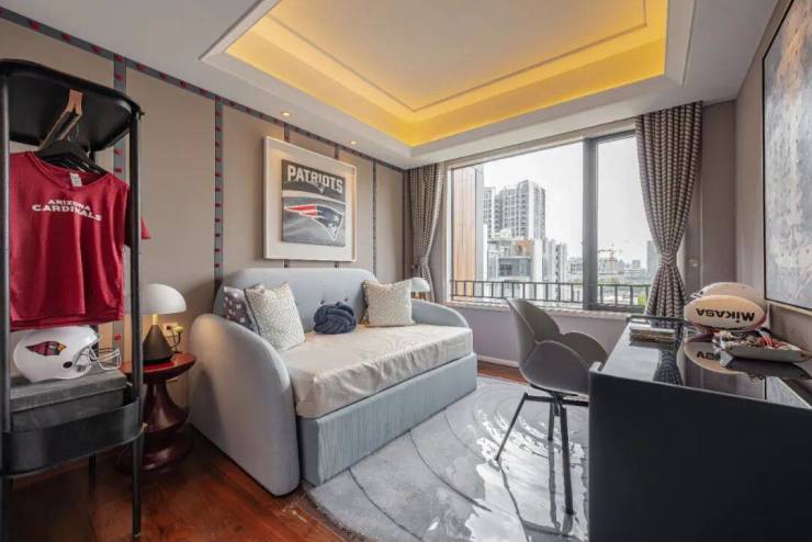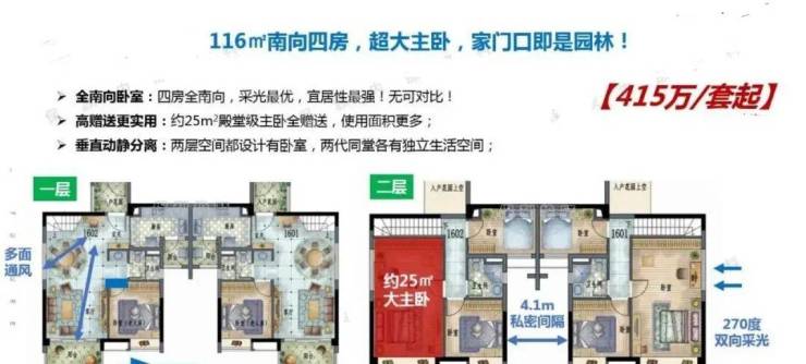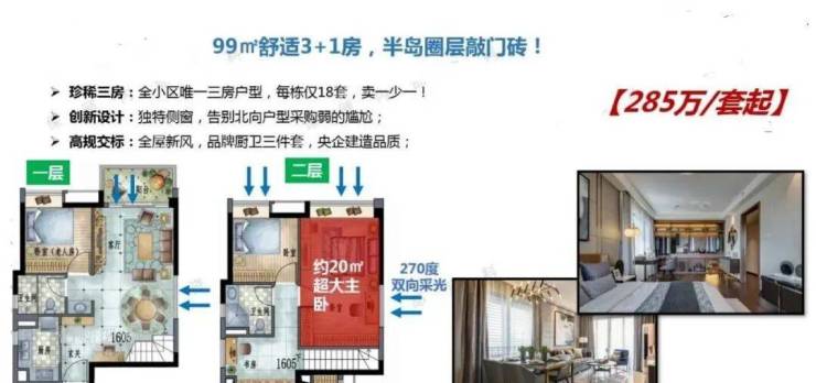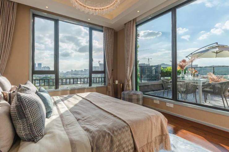 层高约5.8米,赠送约28㎡超大主卧,而特有的两面窗设计,更是保证了270°的采光。