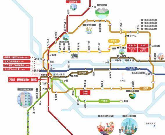交通配套十分便捷。距离 1 号线花地湾站约 800 米,步行轻松可达,为日常出行提供了便利。未来还将接入地铁 25 号线(规划中)、22 号线(在建)以及 28 号线(规划中),进一步加密交通网络,便捷连接珠江新城等核心商务区,无论是通勤上班还是外出休闲都更加高效。自驾方面,通过浣花路、花地大道可快速抵达市区各主要干道,且靠近多条规划中的城际轨道线路入口,方便居民快速到达城市其他区域甚至周边城市。周边多个公交站点也为日常出行提供了更多选择。