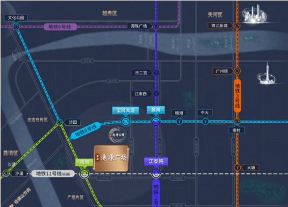 项目周边有四条地铁线路(2号线、8号线、广佛线及在建中的11号线),构成密集的轨道交通网络。驾车出行也十分方便,通过昌岗路、江燕路、环城高速等主干道,约30分钟即可抵达广州南站和珠江新城,约60分钟直达白云机场。