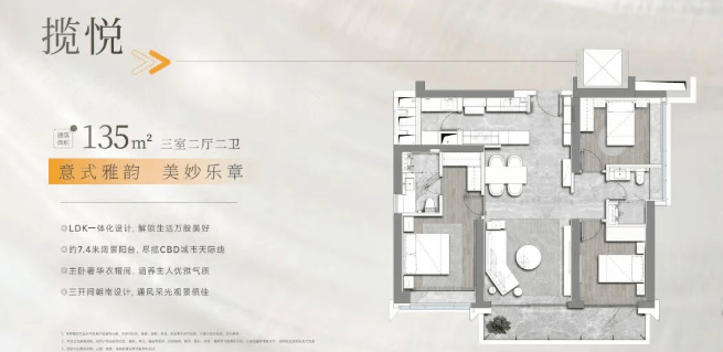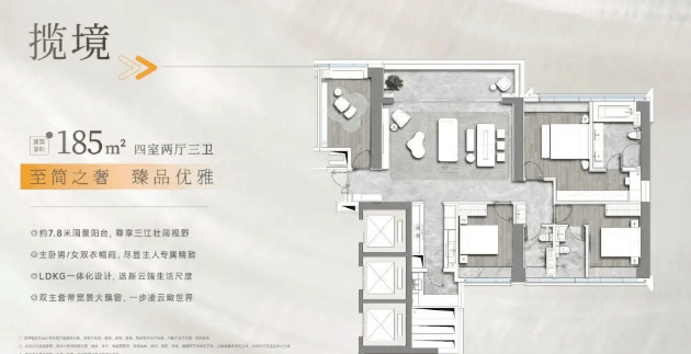 以建面约185㎡的「揽境」臻品为例,该户型采用了大横厅设计,空间开阔,视野极佳。客厅与餐厅相连,形成了一个超大的公共活动区域,无论是家庭聚会还是朋友聚餐,都能轻松应对。卧室则采用了套房设计,配备了独立的卫生间和衣帽间,保证了居住者的私密性和舒适性。此外,该户型还拥有超大的观景阳台,让居住者可以尽情欣赏一线江景的壮丽。