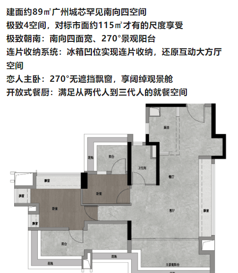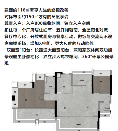 项目主推 88-118㎡南向户型,依托建筑新规实现超 120% 使用率,且 3 栋楼呈北至南 “一字型” 排开,全部户型为东南或西南朝向,保障采光与通风。88㎡户型堪称 “城芯稀缺四空间”,南向四面宽搭配 270° 景观阳台,对标市面 115㎡户型尺度,270° 飘窗主卧与开放式餐厨设计,适配三口之家刚需需求;107㎡四房为 “跃级改善款”,五开间朝南且全屋南北对流,入户玄关避免 “一箭穿心”,双面宽跑道阳台兼顾家政与休闲,X 空间可打造家庭娱乐区,满足三代同堂居住需求;118㎡户型则为 “终极改善” 选择,独立入户 800 库收纳间提升仪式感,360° 环幕景观主卧配独立步入式衣帽间,对标市面 150㎡户型尺度,为高净值家庭提供奢适居住体验。整体户型设计围绕 “零牺牲、零浪费、零遮挡” 核心,最大化利用空间,适配不同家庭结构的改善需求。