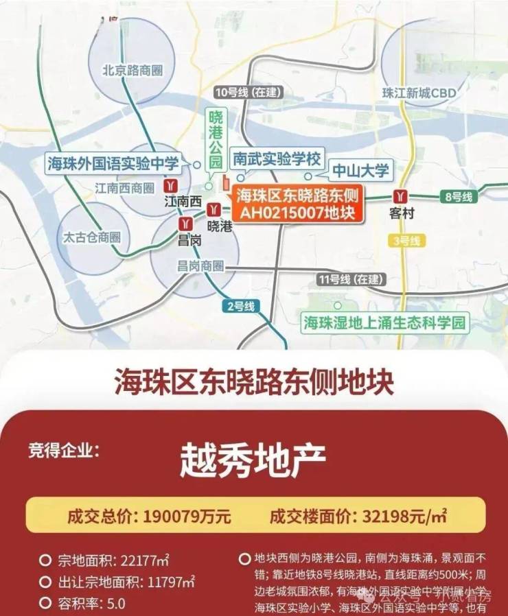 越秀・桂悦东晓是越秀地产继珑悦西关、熙悦江湾后推出的 “广府系” 第三子,2024 年 12 月 3 日以 19 亿元拿下海珠东晓路宅地,拿地即开工并于当月底亮相。项目总占地面积约 2.2 万㎡,建筑面积约 5.9 万㎡,容积率 5.0,规划 3 栋住宅,主推 88-118㎡南向户型,依托建筑新规实现超 120% 的使用率,为海珠当前在售新盘中使用率最高的项目之一。作为板块内多年断供后的首个新规产品,项目主打广府文化特色,从园林设计到交标细节均融入本土元素,精准适配海珠老城刚需与刚改群体,填补了区域优质新房供应的缺口,凭借越秀央企品牌背书与成熟开发经验,成为老城置业的热门选择。
