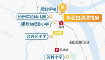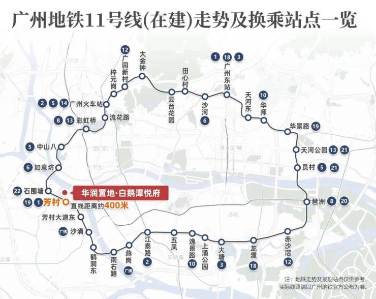 项目距离1号线白鹅潭TOD(芳村站)约400米,后期将会有4条地铁交汇,分别是1号线、11号线、22号线和28号线。其中,1号线已开通,可直达北京路步行街、天河体育西等地;11号线建设中,土建工程完成度已达99%,开通后可直达广州中心各区;22号线二期在建,完成后可直达白云机场;28号线规划中,未来可横跨佛山、广州、东莞三个城市。