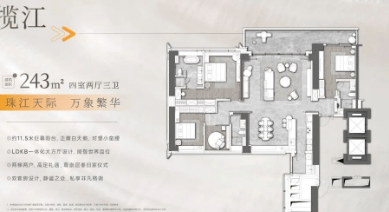 占地面积约19000平方米,建筑面积约171000平方米,容积率为6.19,绿化率28%。项目由5栋住宅楼组成,总层高45至55层,共564户。在售户型为135至243平方米的滨江豪宅,整个项目规模达到约69万平方米,集成了滨江万象综合体,包含约2.2万平方米的滨江公园、约8.3万平方米的高端商办、约1.9万平方米的配建学校、约26.9万平方米的万象城及约17万平方米的三江万象大平层等。