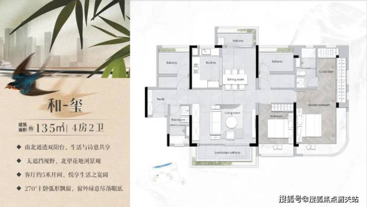142㎡四房两卫:2 梯 2 户独梯入户,8.5 米宽景阳台直面江景,主卧 270° 飘窗拓展 800mm 收纳空间。