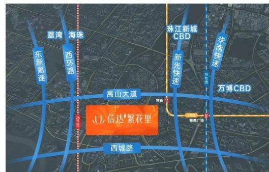 规划优势:规划中的 26 号线有望在禺山大道和西环路交界处设站,届时该项目极有可能成为地铁上盖物业,交通便利性将进一步提升。项目临近禺山大道、西环路两大主干道,接驳东新高速可直达荔湾、海珠,接驳新光快速可畅达万博 CBD、珠江新城 CBD,通达全城。