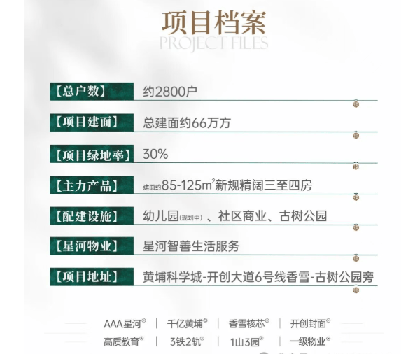 项目总占地约16万方,总建面约66万方,分南北双地块开发,全盘规划17栋住宅、约2800户,整体规划规整大气,居住圈层纯粹。社区采用差异化精工设计,通过楼栋角度科学扭转,实现全系南向采光格局,同时解锁东南、西南双向山景视野,采光通风与观景效果全面升级。整体抬高10米的社区基底,不仅优化居住环境,更提升社区私密性与尊贵感,规避地面潮湿、扬尘、噪音干扰,居住质感远超片区同级刚需楼盘。目前社区楼栋已全面封顶,工程进度稳健,交付安全性极高。户型全部采用广州新规建筑标准打造,空间拓展性极强,实用率近乎100%,无冗余公摊,以刚需面积实现改善级空间尺度。后期由星河自持专业物业团队运维,依托星河成熟的大城社区管理体系,提供精细化园林养护、公区保洁、设施维保、智能安防、便民增值服务,搭配全域智慧安防系统,全天候守护社区安全有序,长效保障业主高品质居家生活。