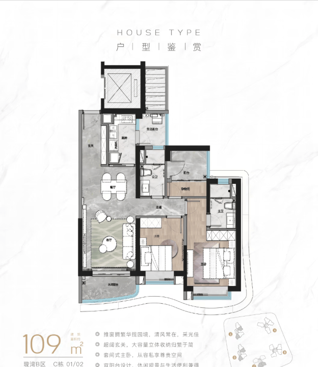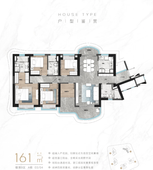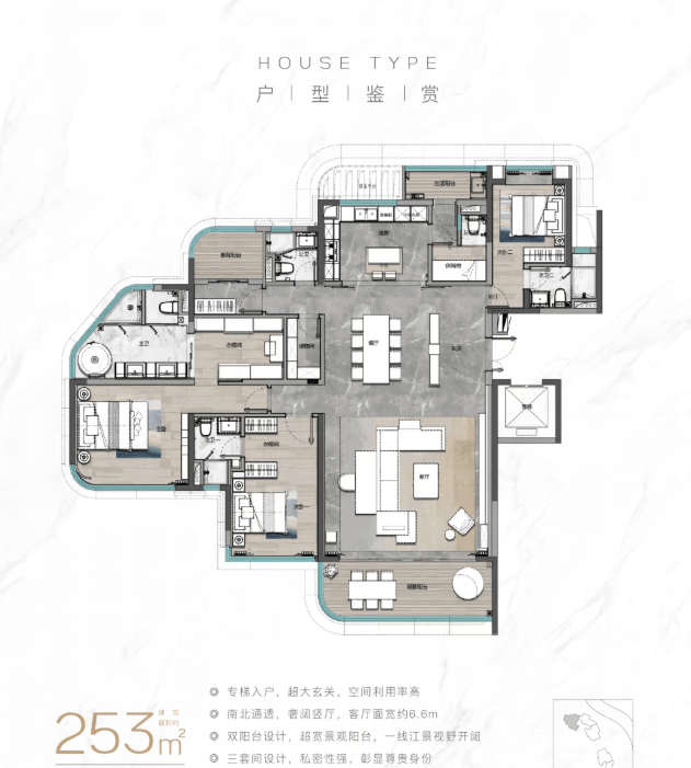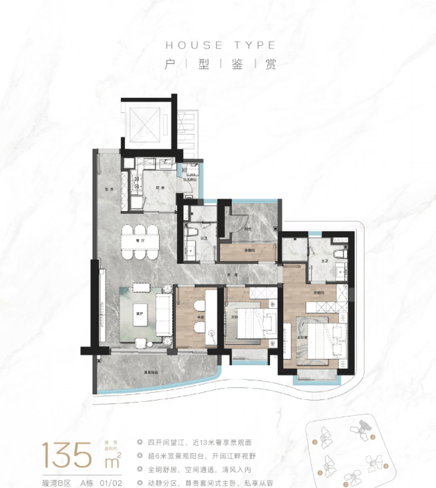 项目当前在售户型丰富,包括109平方米的三房、135平方米的东南向四房、161平方米的大五房以及253平方米的一线临江大平层公馆。所有户型设计均注重空间利用和景观享受,特别是临江大平层,通过270°环幕全景落地窗的设计,将珠江美景尽收眼底,为住户提供了一种高端的生活体验。