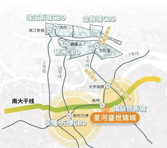 项目距离地铁7号线板桥站大约700米,虽然离地铁稍远,但离中心商业街和学校更近。轻松实现0换乘,2站即达万博核心区域,5站可抵达琶洲。此外,项目周边交通网络完善,出门即可上南大干线,通过多条快速通道直达珠江新城等核心区域,极大地方便了居民的出行。