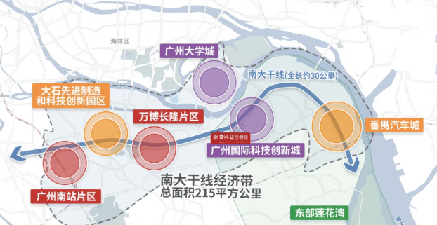 该区域处于连接珠三角东西岸的重要发展走廊上,串联了广州南站、长隆万博、国际创新城以及汽车城等多个关键经济台。这些区域汇聚了包括希音、欢聚时代、迪士普等在内的1900余家高新技术企业,共同支撑了番禺的经济发展。此外,出门即可上南大干线,无缝连接万博和广州南站,并通过多条快速路线直达琶洲、金融城、珠江新城等核心区域,极大地便利了居民的出行。