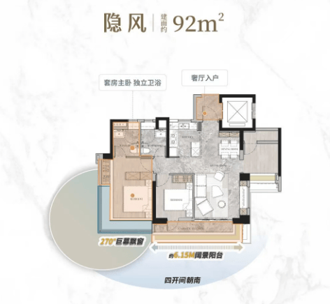 92㎡户型:该户型四开间朝南,拥有约6.15米阔景阳台,主卧配有270°巨幕飘窗,整体布局紧凑实用,适合首次置业者或小家庭。