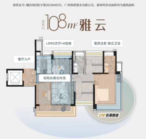 108㎡户型:采用LDKG+X一体化设计,双阳台设置,提供更多的互动空间。270°巨幕飘窗让室内光线充足,视野开阔,适合追求高品质生活的家庭。