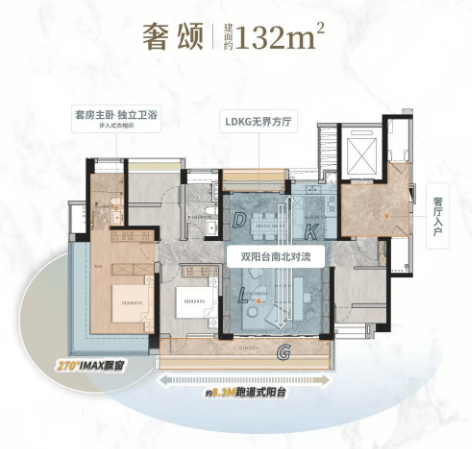 132㎡户型:大方厅设计,配备约8.3米跑道式景观阳台,主卧配有270°巨幕观景窗,提供IMAX级景观体验。厨房采用洄游设计,中西两厨交融,满足多样化烹饪需求。