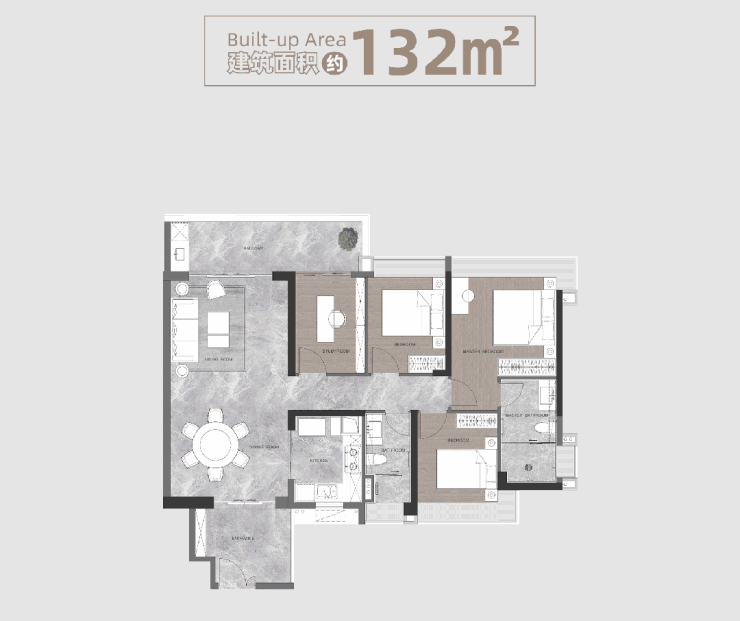 132㎡四房户型,是项目的改善型主力户型,适合四口之家、多代同堂,或者对居住空间有较高要求的购房者。这个户型最大的亮点,就是拥有宽敞的入户花园,入户花园不仅能起到过渡作用,增加居住的私密性,还能作为玄关、储物空间,摆放鞋柜、绿植等,实用性极强,让入户的第一瞬间就感受到满满的仪式感。