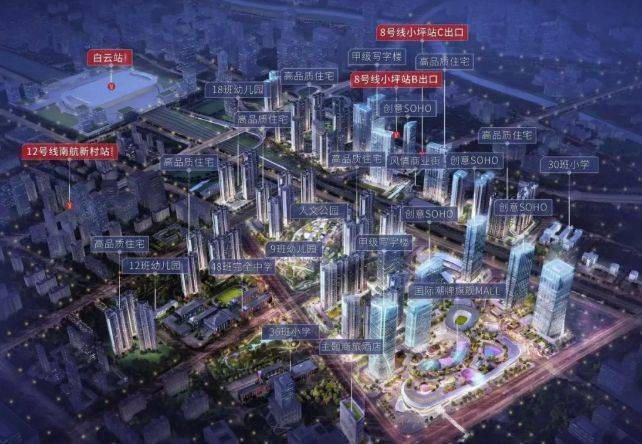 地铁:项目为双地铁上盖,8 号线北延线小坪站已开通,这条号称 “换乘之王” 的线路可与广州另外 13 条地铁线路无缝对接,串联海珠、荔湾、越秀、白云等多个区域。12 号线南航新村站正在建设中,预计 2023 年投入使用,且与火车站规划同步,届时将进一步提升交通优势。