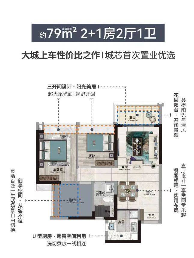 建面约 79㎡3 房 2 厅 1 卫:这款户型在空间利用上堪称一绝。在保证双厅空间宽敞的前提下,巧妙地规划出 3 个房间,且每个房间的空间都未因数量增多而受到挤压。整个户型设计几乎没有丝毫空间浪费,对于预算有限又渴望多居室的购房者来说,无疑是绝佳选择。