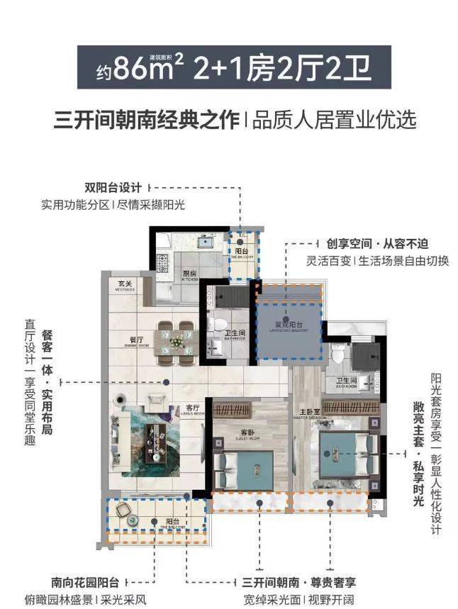 建面约 86㎡3 房 2 厅 2 卫:该户型的主卧采用套房设计,彰显主人的尊贵与私密。景观阳台十分宽阔,从客厅一直延伸到次卧,不仅增加了室内采光和通风,还为休闲观景提供了良好的视野。另外配备的生活阳台,更是为日常生活增添了几分从容,让生活杂物有了妥善的安置空间。