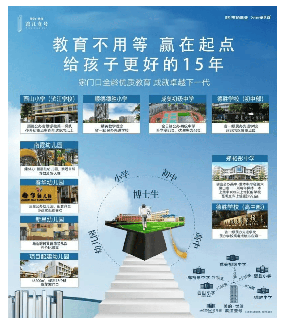 教育方面,美的·滨江壹号同样表现出色。社区内配建约5400㎡的大规模幼儿园,并且对口西山小学滨江学校(省一级学校),确保业主子女能够享受优质的教育资源。周边还有广东顺德德胜学校、郑裕彤中学、华侨中学等优质学府,形成了从小学到中学的全龄段教育体系,为孩子的成长提供了坚实的保障。