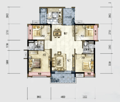 126㎡阔绰四房:4米宽厅设计,揽中轴园景,居住体验优越。