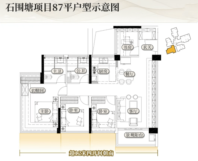 以87平方米四房户型为例,其并非通过入户花园等半封闭空间凑数,而是真正实现了四个可独立使用的房间布局。其中一种格局拥有独立入户玄关,客厅整面墙采光并通铺飘窗,三个卧室与客厅全部朝南,形成超过12米的四开间朝南设计,采光与通风效果极佳。另一种格局则位于梯腿单边位,实现真正南北对流,并配备约3.7米宽的大阳台,主卧与主卫均采用双面屏视野设计,增强了空间的通透感与景观体验。