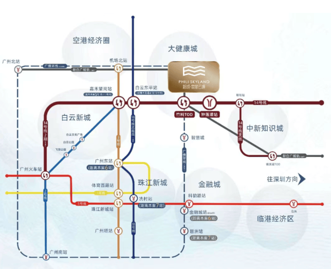 更令人期待的是,规划中的18号线北延段将在白云东平站与14号线交汇,未来从项目出发,7站即可直达珠江新城冼村;同时,通过竹料站还可换乘广佛环线与新白广城际。广佛环线3站达天河智慧城,5站抵琶洲;新白广城际则1站直达白云机场,并南向贯通东莞、深圳。多维轨道交通网络,让新城翡丽云境真正实现“半小时湾区生活圈”。