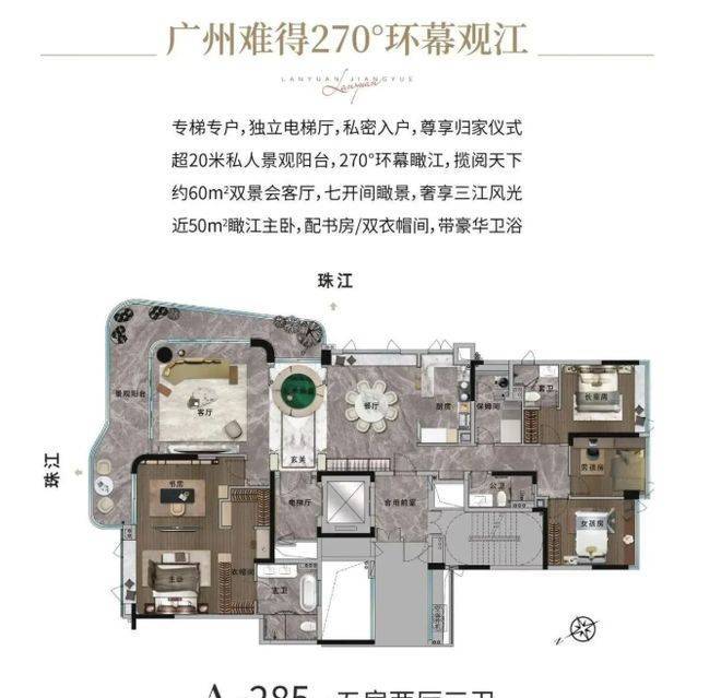 兰园江悦能成为热门,那可是有不少 “绝招”。它在广州主城核心的白鹅潭 CBD,还是三江交汇处,江景距离仅约 90 米,比不少标杆豪宅都近,站在高处看三江交汇,震撼感十足。周边配套更是未来可期,白鹅潭大把项目在建,啥万象城、太古里都要来。就俩户型,193㎡和 285㎡的江景大平层,专梯入户,妥妥的高端配置。物业请的也是 “狠角色”,服务有保障。再加上建筑设计、装修都很讲究,这样的江景豪宅,谁能不心动?