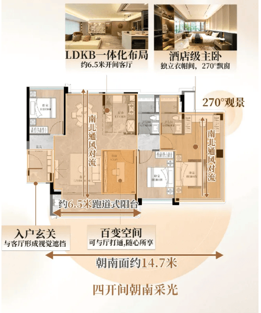 建面约106㎡四空间:新规产品,使用率超130%,满足全周期家庭需求;全明户型,双轴线南北通透,约14.7米南向面宽,餐客厅与主卧均南北通透;独立入户玄关,优化入户动线,营造归家仪式感。