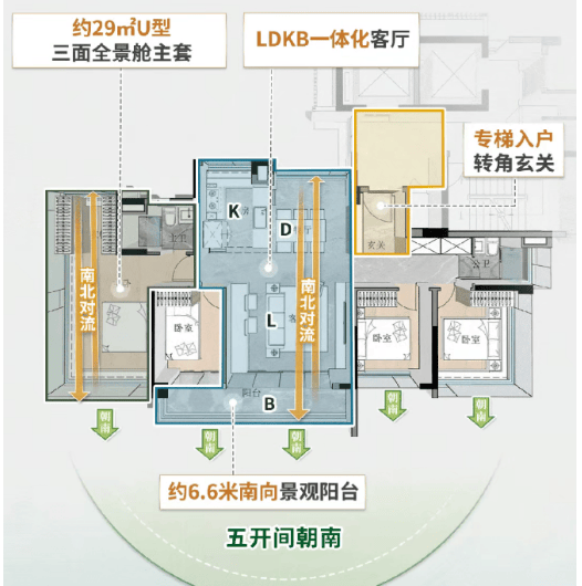 建面约87㎡四空间:中轴稀缺新规小户型,超高使用率,LDKB一体化布局,约5.2米开间客厅,X空间随心利用;约11.6米南向尺度,四开间朝南,搭配宽幕观景阳台,推窗即享园景,采光通风俱佳。