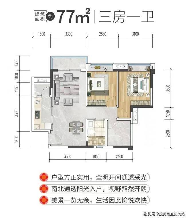 户型面积77-111㎡,3-4房设计,精装交付,舒适宽敞大厅,适合家人齐聚。2梯6户20层洋房;超高使用率,高达80%;动静区分明,互不打扰适合大家庭居住。