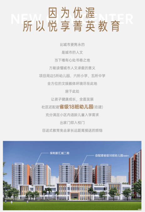 答:保利新汇城自身配建的幼儿园已封顶。对于中小学,项目所在片区(广湛高铁新城)规划有一所高标准的九年一贯制学校,随着片区城市更新的快速推进,该校的建设也在计划之中。具体的学区划分,需以项目交付后,当年教育主管部门公布的最新招生政策为准。但可以确定的是,作为佛山重点发展的城市新中心,片区的公办教育配套一定会高标准、高质量建设。