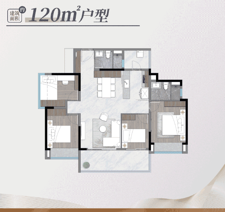 110㎡四房两厅两卫户型,套内实用面积可达112㎡,实用率超100%,户型格局方正,动静分区明确,兼顾了居住的私密性和舒适性。一体化公区面积达40㎡,连接南向景观阳台,阳台进深1.8米,宽度6.8米,可作为休闲区、晾晒区、养花区等,满足业主多样化的需求;四个卧室分布合理,主卧朝南,配备独立衣帽间和主卫,衣帽间面积达6㎡,可满足业主的储物需求,主卫采用智能马桶、恒温花洒等高端配置,提升居住品质;三个次卧面积均在10㎡以上,可作为儿童房、老人房、书房等,灵活适配家庭结构的变化。