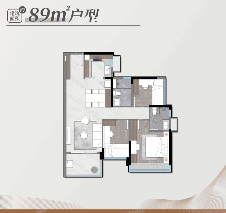 具体来看,89㎡三房两厅两卫户型,套内实用面积可达89㎡,实现100%实用率,户型方正,南北通透,采光通风俱佳。客厅、餐厅、厨房、阳台四大功能区可全部打开,形成一体化公区,面积可达35㎡左右,满足家人日常活动、亲友聚会等多种需求;X空间为客厅旁的次卧,两者之间采用非承重墙设计,可根据业主需求自由拓展,既能作为独立次卧使用,也可与客厅打通,打造更大的公区空间,适配不同家庭的居住需求。厨房采用U型设计,操作台面长度达2.8米,预留了冰箱、洗衣机等家电摆放位置,烹饪动线合理,让做饭成为一种享受;卫生间采用干湿分离设计,主卫配备独立淋浴间和浴缸,次卫紧邻次卧,方便老人和小孩使用,提升居住舒适度。