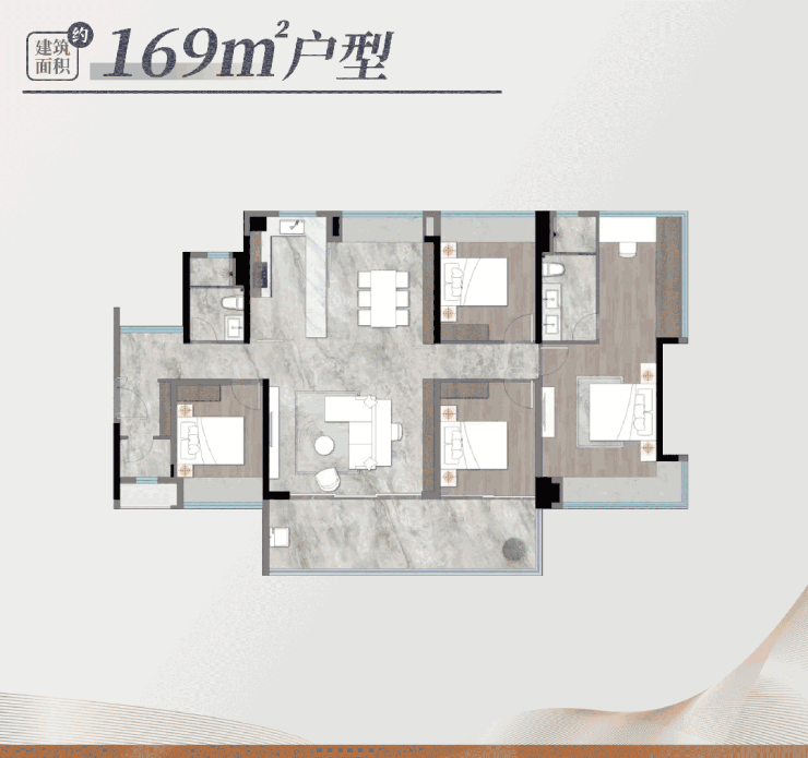 169㎡大平层户型,套内实用面积可达172㎡,实用率超100%,是项目的高端改善户型,采用四房两厅三卫设计,南北通透,视野开阔。一体化公区面积达60㎡,采用横厅设计,客厅宽度达8米,连接南向超大景观阳台,阳台进深2.2米,宽度10米,可俯瞰社区滨河园林和外部公园景观,打造极致的观景体验;主卧采用套房设计,面积达35㎡,配备独立衣帽间、主卫和书房,衣帽间面积达12㎡,主卫配备双台盆、浴缸、智能马桶等高端配置,彰显主人的尊贵身份;三个次卧均为套房设计,配备独立卫生间,满足家人的私密需求,同时预留了保姆房,兼顾了实用性和舒适性。
