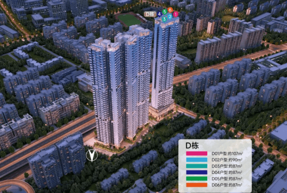 答:目前主推 D 栋,主力户型为 87㎡与 107㎡三至四房,ABC 栋为准现房状态,实景可见。