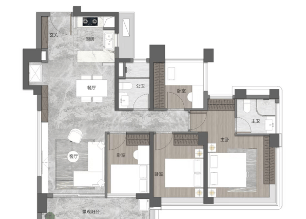 119平方米四房户型:南北通透,灵动宽厅设计,独立入户玄关,步入式套房配置。