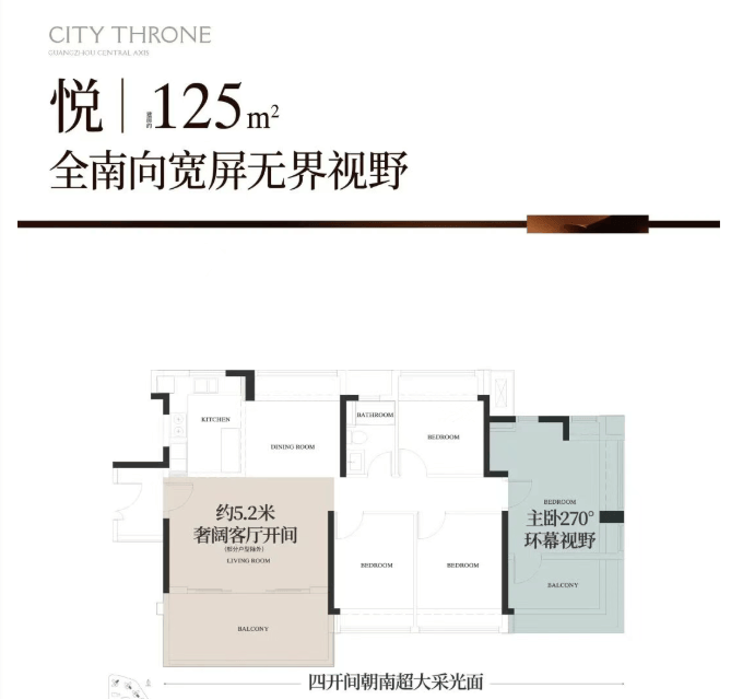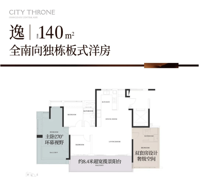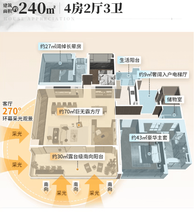 240㎡五房两厅四卫(豪华改善型):该户型是项目最新加推的南向大平层,适合大型高端家庭或追求极致居住体验的人群,户型方正,南向采光,空间尺度恢弘,尽显豪宅格调。客厅面宽约6.0米,进深约8.5米,面积约51.0㎡,空间开阔大气,连接南向超大景观阳台,阳台长度约12.0米,宽度约2.2米,可俯瞰社区园林、高尔夫球场与汇景湖景观,视野无遮挡,是休闲观景、圈层社交的理想场所。主卧套间面积约42.8㎡,配备独立卫生间、步入式衣帽间、书房与超大飘窗,南向采光,视野开阔,卫生间配备双台盆、嵌入式浴缸、智能马桶与淋浴区,采用高端石材与品牌卫浴,彰显高端品质;三个次卧为套间设计,面积分别约20.5㎡、18.6㎡与17.2㎡,配备独立卫生间,空间充足,舒适度高;另一个次卧面积约14.8㎡,可作为书房或儿童房,灵活适配家庭需求。厨房为中西双厨设计,面积约15.6㎡,中厨操作空间充足,西厨配备大型岛台,可同时容纳多人操作,满足高端家庭的烹饪与社交需求;四个卫生间均为干湿分离设计,布局合理,材质高端,使用便捷。该户型的实用率高达84%,空间利用率极高,同时配备了3.15米的层高,搭配六恒系统,进一步提升了居住舒适度,是2026年项目的核心推售户型。