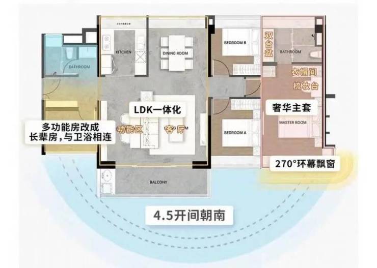 4. 主卧优势:打造270°景观主卧,采用全景飘窗设计,最大化呈现南向江景与河涌景观,闲暇时可坐在飘窗上欣赏江景,感受自然之美,同时主卧空间宽敞舒适,采光充足,保障休息质量。