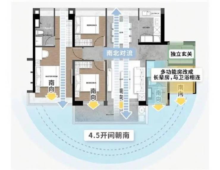 3. 采光优势:4开间朝南,拥有约14.5米超大南向采光面,是项目采光最好的户型之一,室内每一个区域都能获得充足的自然光线,明亮通透,同时搭配大面积全景窗户,最大化呈现南向江景与园林景观,视野开阔,推窗见景。