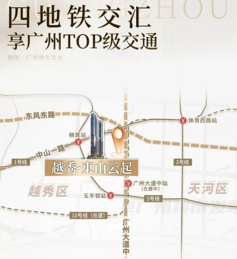 项目距离地铁杨箕站约700米,五羊邨站和体育西路站约800米,交通出行极为便利。预计今年通车的10号线将在广州大道中设站,步行仅需约400米左右。开车出行同样便捷,通过广州大道中及中山一立交,可以快速连接东风东路、中山一路以及内环路,轻松到达主城区各个角落。