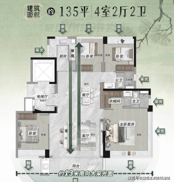 A:建面约125㎡四房户型实现四开间朝南,得房率125%,适合改善型家庭。
