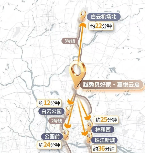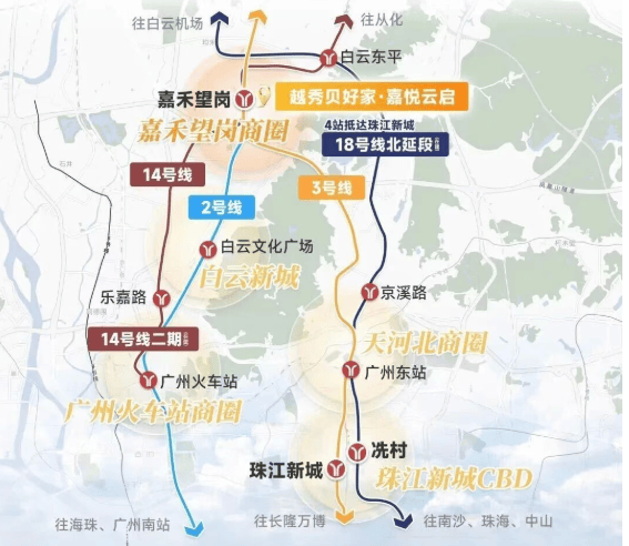 越秀嘉悦云启作为真・地铁上盖的 TOD 项目,交通优势堪称得天独厚。楼下便是 2 号线、3 号线与 14 号线的交汇站点 —— 嘉禾望岗站 ,如此强大的地铁能级,在广州众多楼盘中实属罕见。3 号线宛如一条经济动脉,串联起机场、珠江新城、天河北等核心区域,让你在短时间内即可抵达城市的商务、经济中心;2 号线则贯穿白云新城、公园前等重要地段,为你的出行提供了更多的选择。搭乘这两条线路,无需换乘,便能轻松畅达城市各处,真正实现了半小时通勤核心产业区的便捷生活。