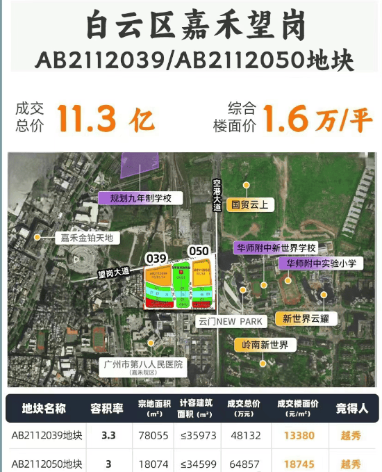 经过多轮激烈竞价,原本起始价为 4.16 亿的地块,最终越秀地产以 4.81 亿的高价成功拿下,溢价率高达 16%。这一结果不仅展现了越秀地产对该地块的志在必得,也反映出市场对嘉禾望岗区域未来发展潜力的一致看好。随后,越秀地产再次发力,将嘉禾望岗 AB2112050 地块收入囊中,以 6.49 亿的总价,溢价 18.23%,楼面价 18745 元 / 平方米 ,成功实现了对这两个优质地块的打包收购。
