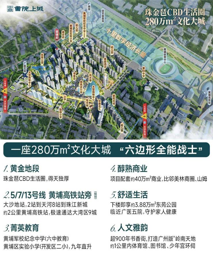 项目的配套堪称“航母级”,覆盖商业、教育、生态、人文全维度。商业配套方面,项目自身规划约40万㎡全业态商业,涵盖星级酒店、大型购物中心、风情商业街,同时毗邻大沙地、三溪成熟商圈,美林天地、宜家、山姆会员店等举步可达,消费能级堪比“小珠江新城”。教育配套是项目的王牌,家门口即享省级名校——黄埔区实验小学(开发区二小教育集团成员)与黄埔军校纪念中学(广州六中教育集团成员),两校均采用名校集团化管理,师资力量雄厚,业绩出众,可实现“目送式”九年优质教育。生态与人文资源更是稀缺,下楼即享约3.88万㎡的东苑公园(国家永久保护绿地)与浩渺东苑湖,高层单位更可南向无遮挡远眺珠江与小蛮腰。社区旁环绕着有超900年历史的横沙书香街,52间古私塾沉淀的人文底蕴,为社区赋予了深厚的文化底色。