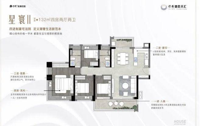 此户型进一步优化了空间布局,四房设计满足家庭成长需求。客厅宽敞明亮,连接景观阳台,不仅增加采光面,还拓展了生活空间,可作为休闲娱乐、亲子活动的场所。主卧套房设计,配备独立卫生间和衣帽间,为业主提供私密、舒适的休息空间。次卧空间也较为充裕,可根据家庭需求灵活布置为儿童房、书房等。整体户型动静分区明显,活动区与休息区互不干扰,为家庭生活提供宁静与和谐。